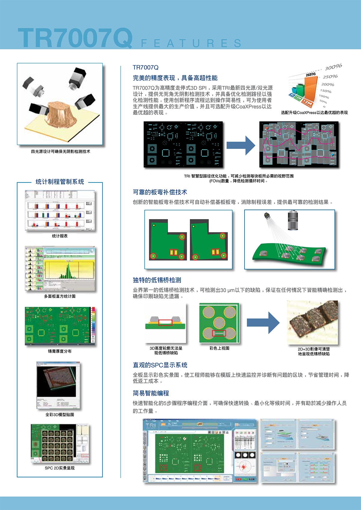 ? 100%無陰影雙光源/四光源數位條紋投影? 優化的走停式設計提供最佳精準度? 智能板彎補償可解決PCB變形問題? 100%錫膏缺陷覆蓋率可檢測低錫橋
